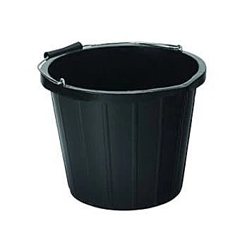 Black 2 gallon bucket with ribbed sides and a sturdy wire handle.