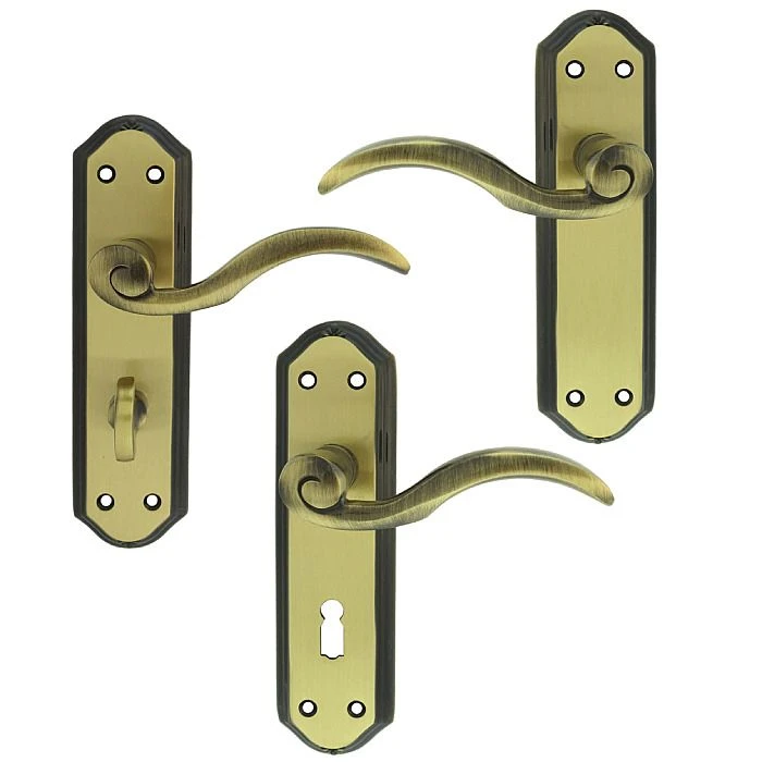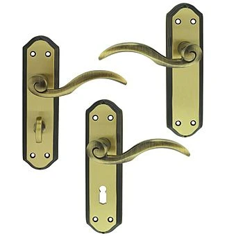 A beautifully finished brass door handle which is available as a plain latch handle, bathroom lock handle, or keyhole lock handle. The handle is supplied with antique appearance screws as well as the latch spindle, and the bathroom version also comes with the smaller spindle, and knobs that works with bathroom locks.
