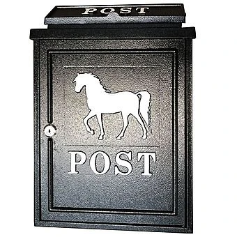 Heavy duty diecast post box from De Vielle, ideal for wall mounting on the outside of your front door. Fitted with a secure lock and supplied with 2 keys. Designed with an outward opening letter flap for additional security measures. Black gloss finish with a decorative horse pattern on the front.