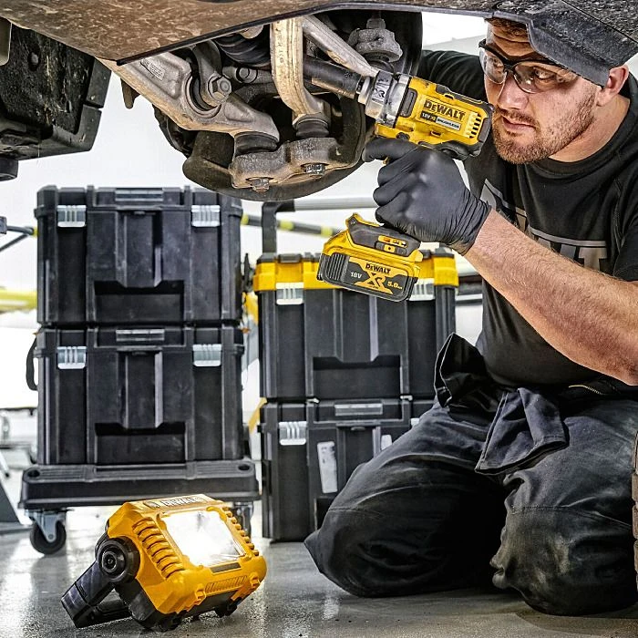 Aimed at mechanics and engineers, but sure to be popular with electricians, plumbers and other trades, this task light has a single LED array which outputs 2,000 lumens at full brightness mode. It will work with a huge range of DeWalt Lithium-ion batteries in their XR range including 10.8V, 12V, 18V (original and PowerStack) and 54V FlexVolt. To protect it when working in workshop environments and outdoors, it is ingress protected to a rating of IP54. The carry handle is adjustable around 180 degrees, and doubles as a stand. There are also two common tripod threads in the handle.