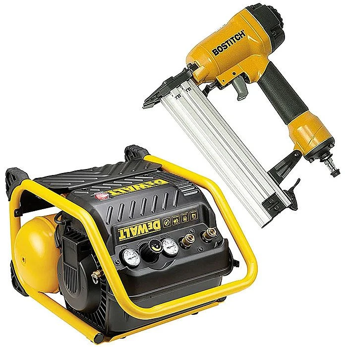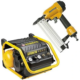 This combi kit includes the Stanley Bostitch SB-HC50FN 16 Gauge 1.8mm concrete block nailer plus the DEWALT DPC10QTC super quiet air compressor. The compressor has a capacity of 10 litres and is rated at 1100 Watts power with a maximum working pressure of 13.8 Bar. The nailer is super reliable and easy to use in combination with the compressor. It is ideal for driving tungsten hardened nails into many types of concrete block, and is commonly used to fix skirting, architrave and gripper rods.