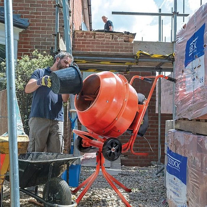This full size portable cement mixer from Draper Tools is suitable for use by both professionals and DIY users on small to medium building projects. It runs from standard 230 Volt mains electricity and uses an efficient induction motor that only draws 650 Watts of energy. The large 160 litre capacity drum takes approximately two seconds per revolution, or 28 rpm. The mixer comes with an optional four leg stand, great for getting the mixer off the ground for a more comfortable working height.