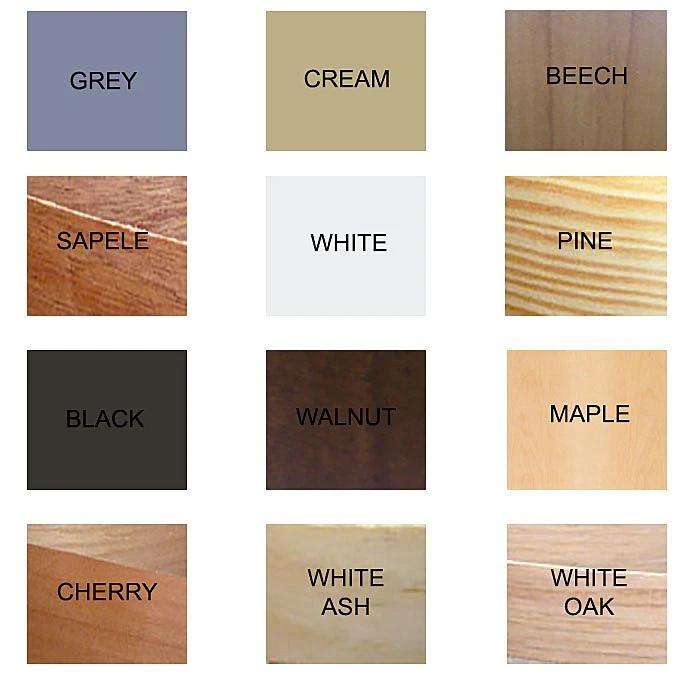 Colour:….. White, Grey, Black, Cream, Steamed Beech, Cherry, White Ash, Walnut, Pine, White Oak, Maple, Sapele