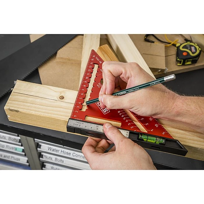 This speed square from Jack Sealey features metric measurements. It is about 17.5cm in length and features a built-in spirit level as well as a removable 10cm mini steel rule. The square is manufactured from aluminium and includes all the measurements you would expect from a speed square.