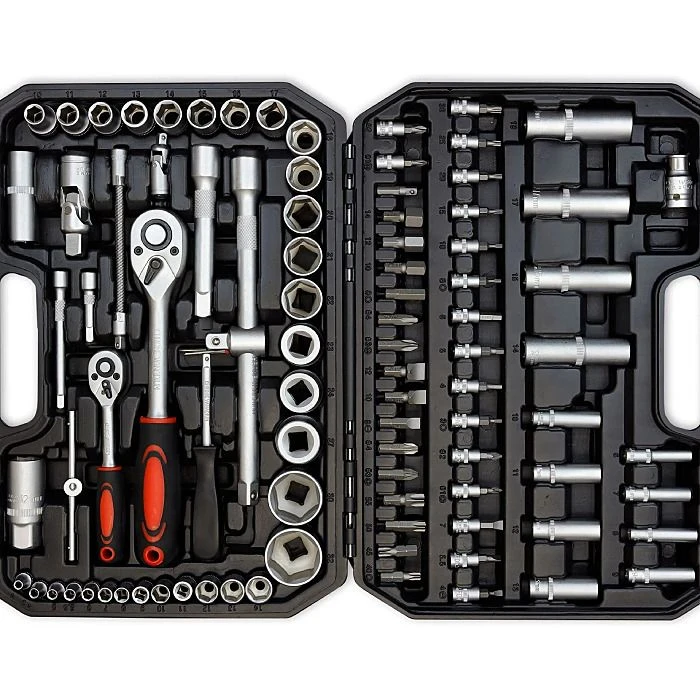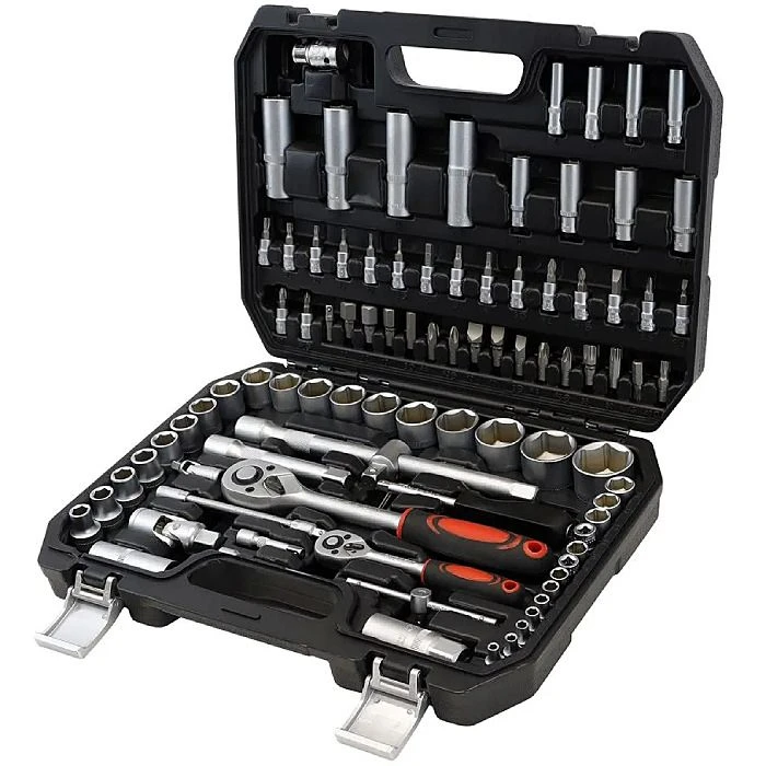With 94 components total, this large tool kit is suitable for a large range of jobs in the garage. It has a massive range of 31 sockets, plus spark plug sockets. There are two sizes of ratchet wrenches as well as a hand driver or spinner handle. There is also a range of different screwdriver bits, some of which can be used with the ratchet wrenches or T-bar. All of this is supplied in a blow moulded carry case which has labels for each of the parts.