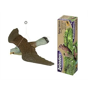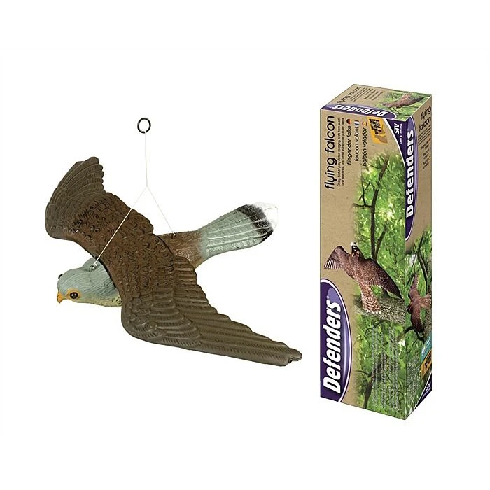 This fantastic and real looking plastic flying falcon has been brought to you by STV International as part of their Defenders pest and animal control range. The flying falcon has been manufactured from tough and durable plastic that is inert; resistant to rust and corrosion making it ideal for outdoor and garden use. There are multiple advantages to using real looking animals as they help to deter larger animals and insects. Naturally falcons are birds of prey therefore a major deterrent to rodents and birds. It is a cheaper alternative to rodents poisens, sprays and traps where is has a much longer life span and requires a one off purchase only. The falcon incorporates real looking grey, yellow and brown colours and has been moulded to portray an ‘in flight’ posture. It gives the effect of a diving bird of prey while featuring a large 21 inch wingspan. A hanging system is included which allows user to mount the falcon to a wall or alternatiively hang it from a tree or various other structures.