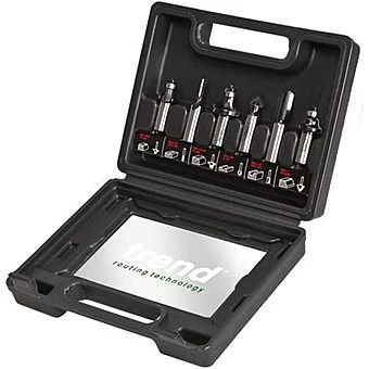 These half inch shank router bits are in this six piece set, designed to get a new router owner started out with the most commonly needed router bits. The fantastic value set includes a two flute 1/4″ cutter, two flute 1/2″ cutter, 1/4″ guided 1/4″ round over, guided 3/8″ round over, guided 5/32″ ogee, and a V groove. These are all high quality Trend manufactured bits which can be used with hardwoods, softwoods and manufactured boards.
