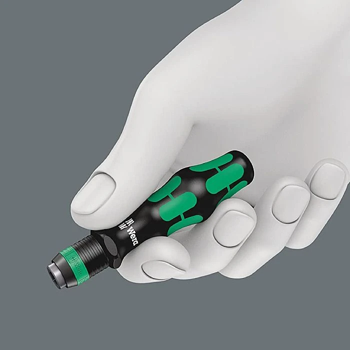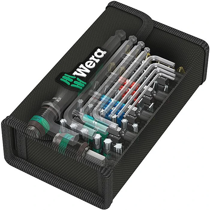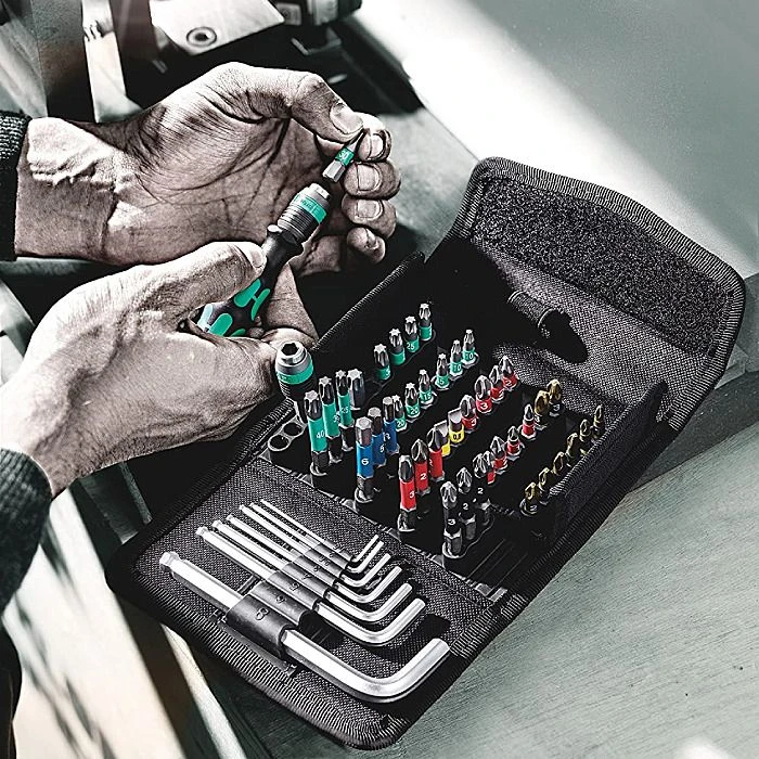 Supplied in a very durable textile pouch that is designed to take up as little space as possible when closed, but give full access to all bits when open, this set of 52 screwdriving bits from Wera gives you a large number of options. They are suitable for use in power screwdrivers and drills, and the longer 50mm bits are impact rated for use in impact drivers. For holding the bits, the included Rapidaptor holder fits 1/4″ hex bit holders or chucks, and not only magnetically holds the bits, but also mechanically holds them until you move the release ring. If you don’t have a drill handy, there is a small compact bit holding screwdriver included which also has the Rapidaptor technology built-in.
